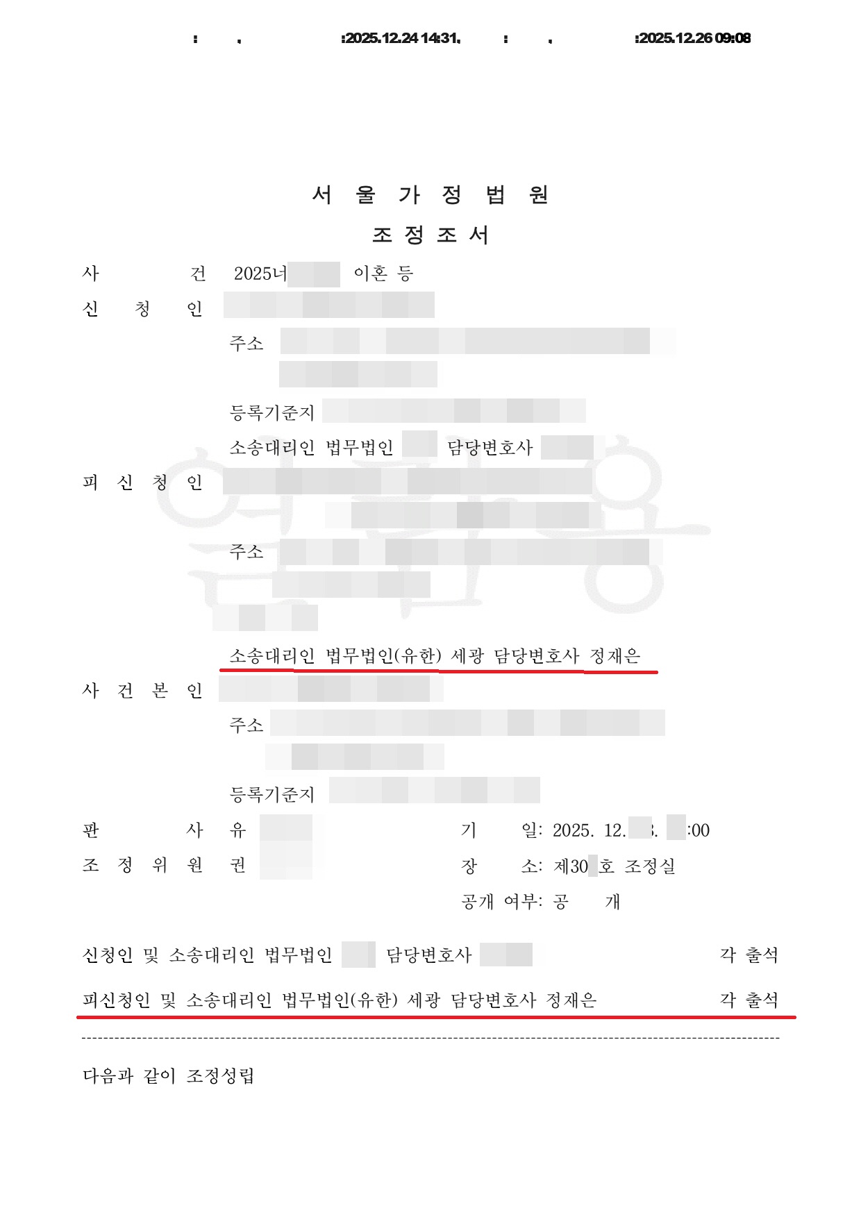 조정을 통해 합의한 내용으로 마무리한 조정이혼 사례 페이지 정보 작성자 정재은변호사 조회51회 댓글0건 관련링크 이전글 다음글 목록 본문 1. 사건 개요의뢰인(남편)과 상대방(아내)은 오랜 별거를 통해 소원해졌으나서로 왕래나 소통도 없었기에이혼이나 재산분할 관련한 대화나 합의가 불가하였습니다. 2. 변호사의 조력 의뢰인(남편)와 상대방(아내)이 서로 구체적인 이혼 조건에 대해 조정기일 논의를 통해 합의하였고첫 조정기일에 조속한 마무리를 하였습니다. 이전글 다음글 목록
