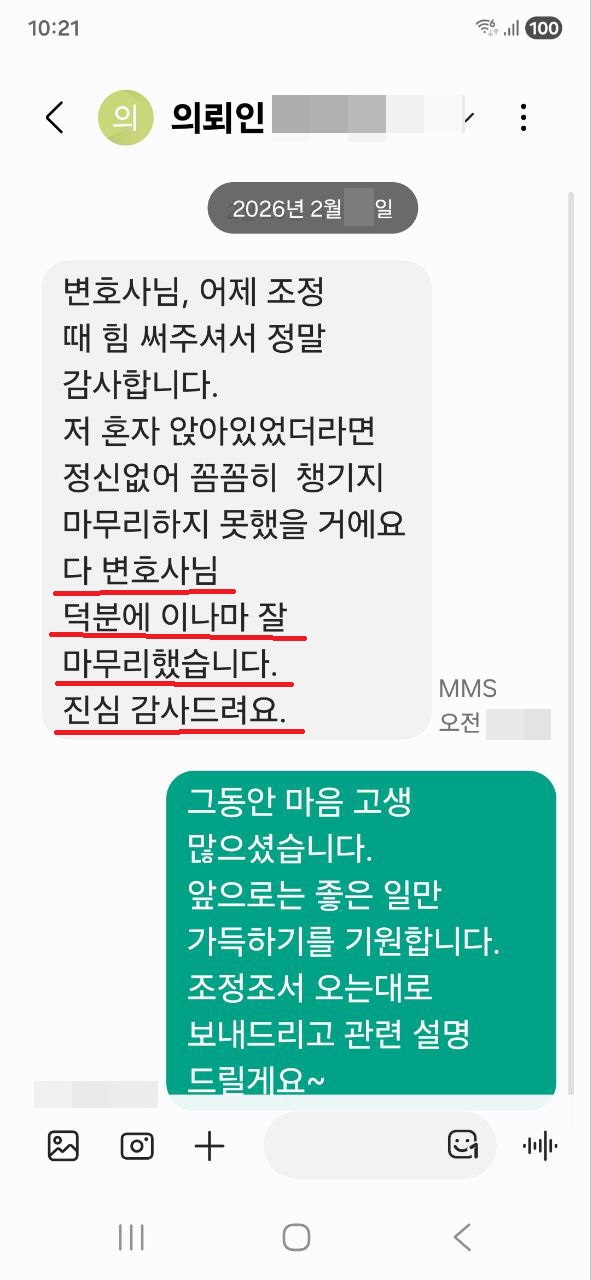 이혼조정을 무사히 마친 의뢰인 감사 인사 후기 페이지 정보 작성자 정재은변호사 조회55회 댓글0건 관련링크 다음글 목록 본문 이혼조정을 무사히 마치고 조정이혼을 마무리하게 된 의뢰인 분이이혼 조정 진행 동안에 큰 도움이 되었다고 감사 인사를 보내주셔서 보람을 느꼈습니다. 다음글 목록